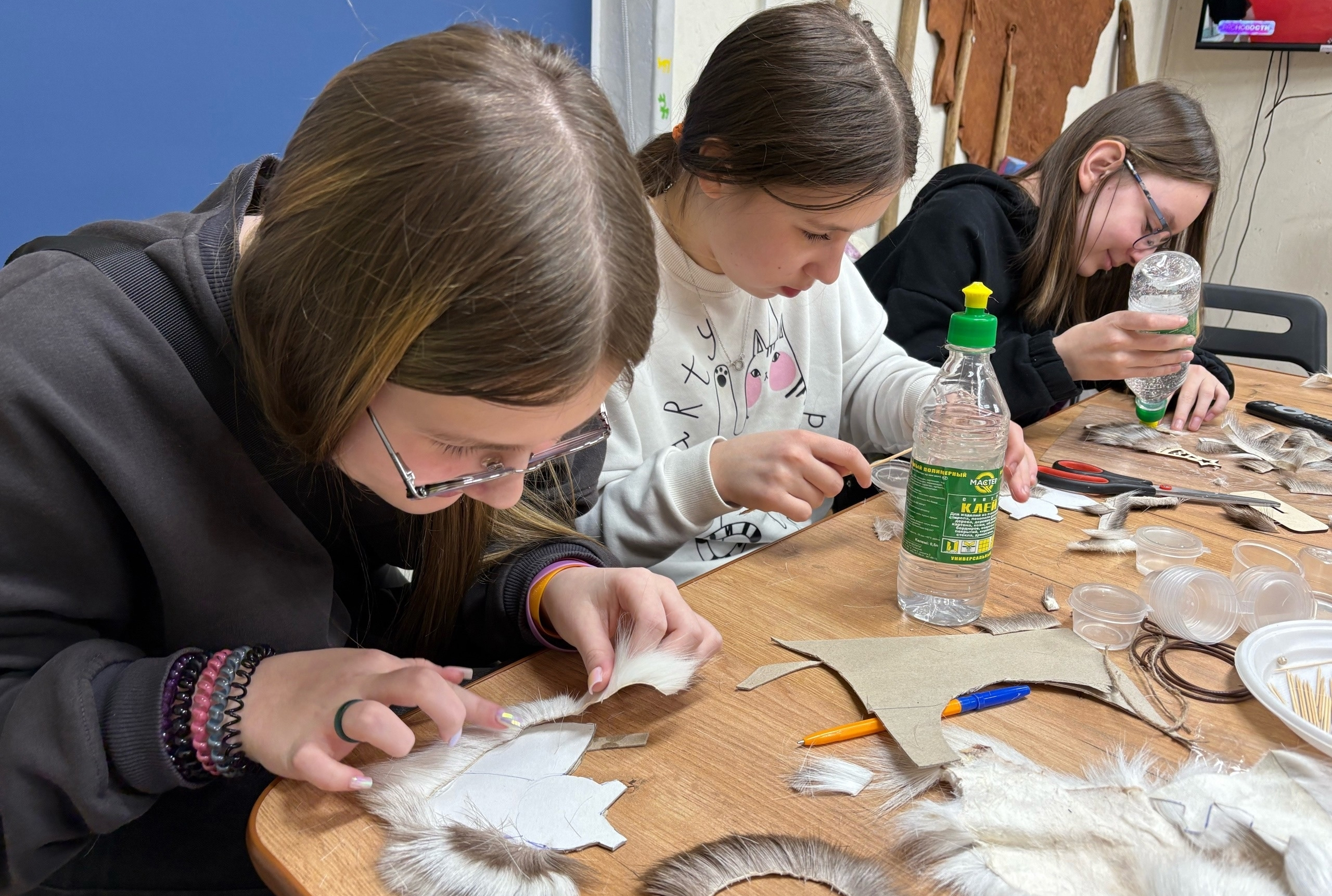 На занятии «Меховые загадки» дети из МБУДО «Центр детского творчества» мастерили поделки и учились через игру и наблюдение. В итоге появились целые композиции — от оленят до северных пейзажей, которые стали частью выставки проекта «Ремесленный амбар» в Музее истории, культуры и быта кольских саамов.
